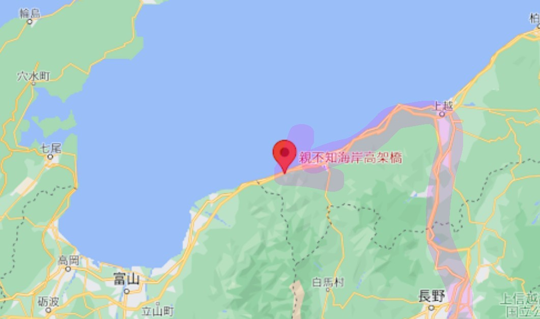 立体で見ると良くわかるんですが、北アルプスの北端が日本海に落ち込んで断崖絶壁!平地ナシ!