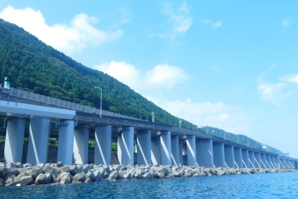 右側に海の上の高速道路。凛々しいわぁ〜。