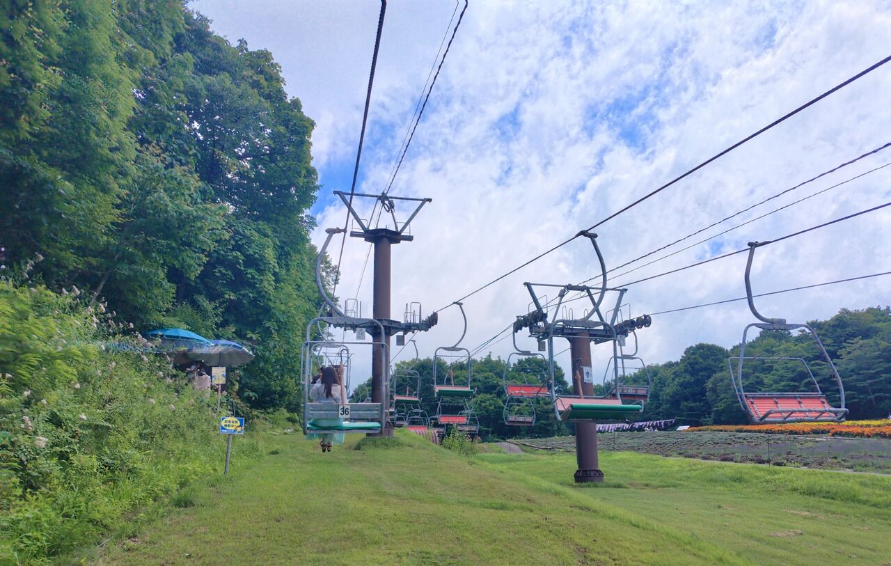 冬はスキー場のこの場所、まずはリフトに乗って上へ。リフト代は有料。でもツアー割引アリなのでお得。